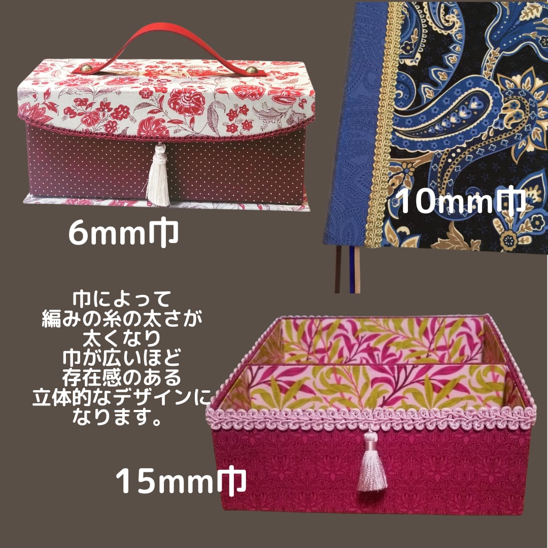 モアレ生地やタッセルと、このブレードとの相性もとても良いので、組み合わせのアイデアで素敵な作品を生み出してみてください。