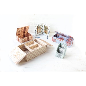 カートナージュとは、厚紙や布を使って美しい作品を作る技法です。説明書に従って製作するとスタンダードのものが簡単に完成します。さらにご自身のアイデアでデコレーションをしていくだけで、センス溢れる作品が完成します。