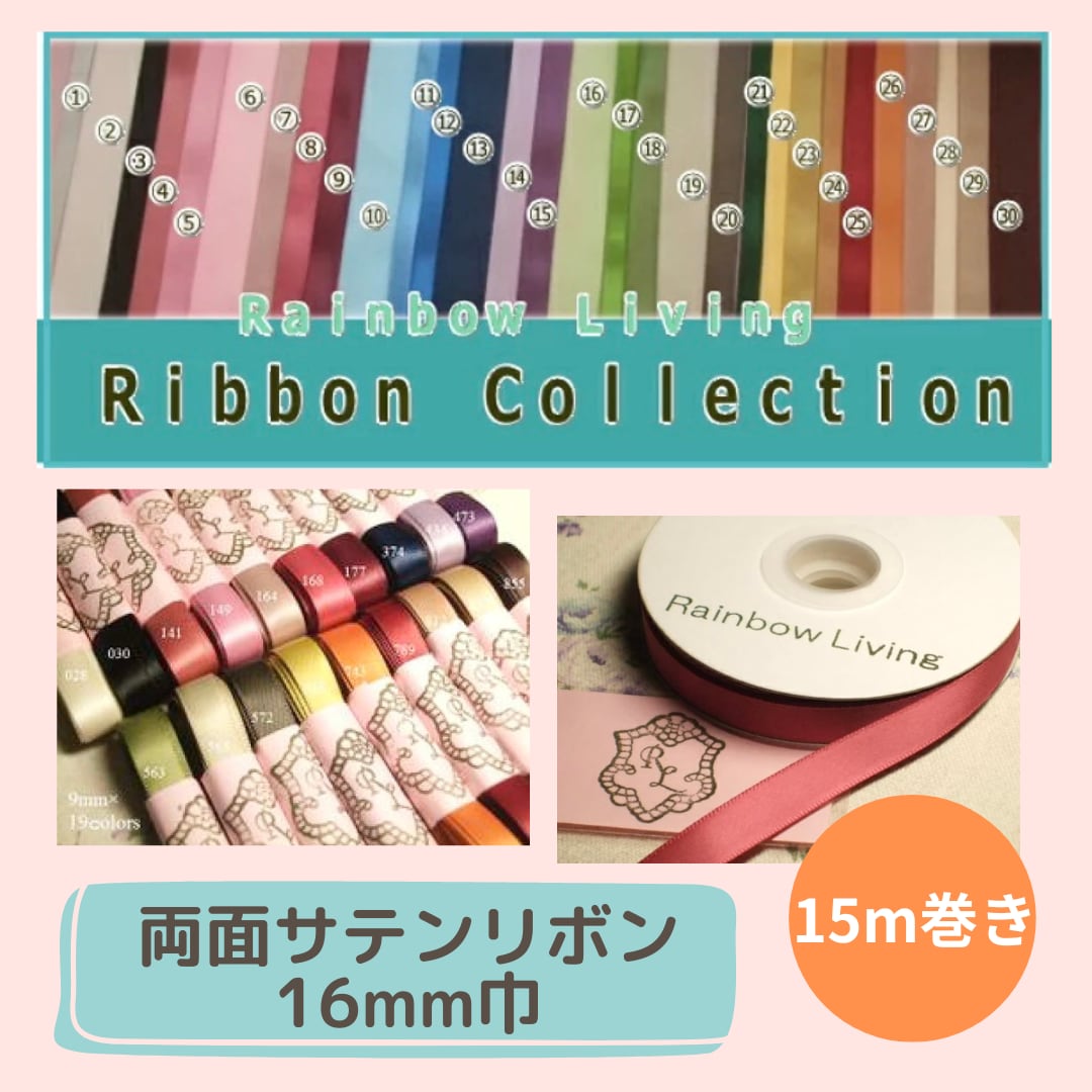16mm巾×15m巻き 両面サテンリボン 全30色